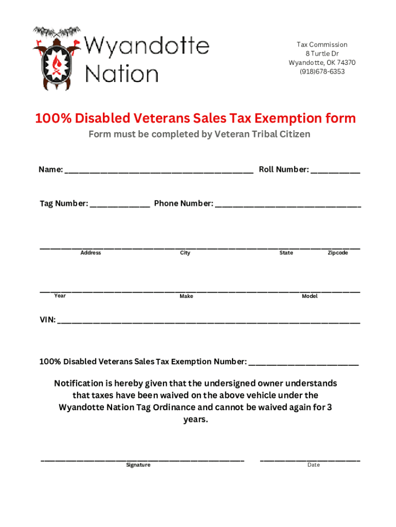 (918)6786353100% Disabled Veterans Sales Tax Exemption form must be completed by Veteran Tribal CitizenName: ___ Roll Number: ___Tag Number: ___ Phone