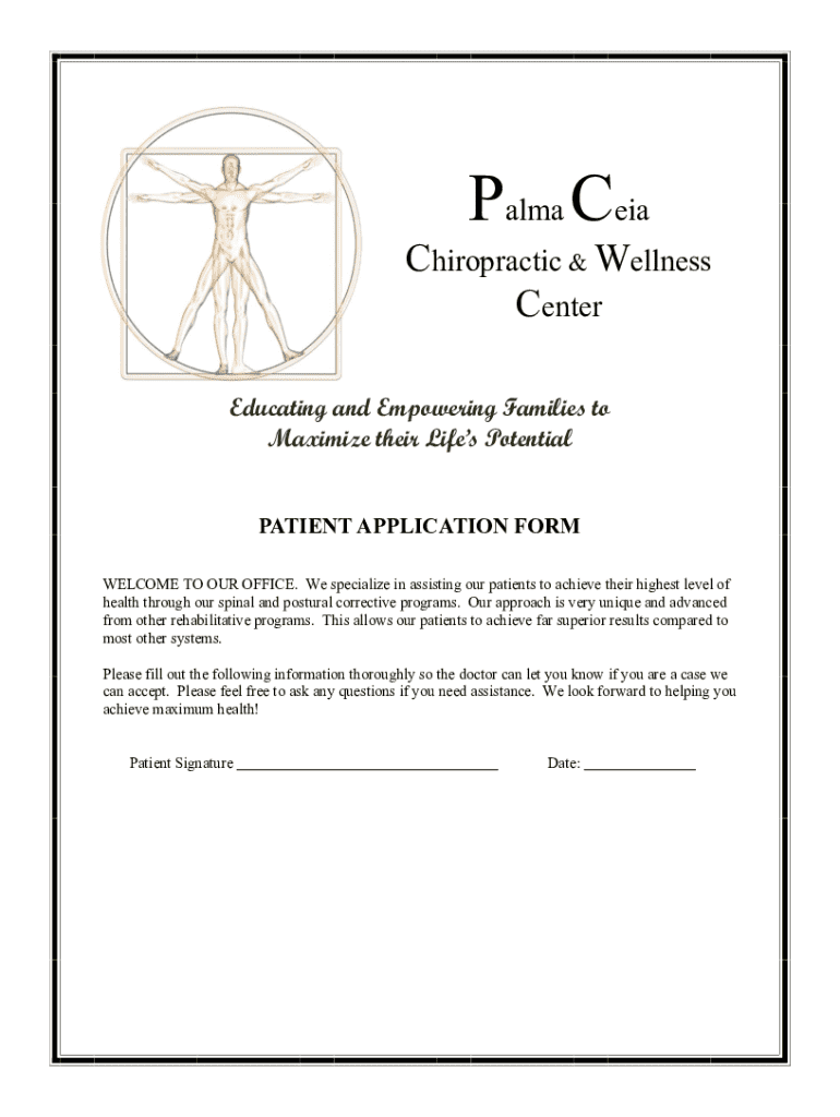 Palma Ceia Chiropractic & Wellness Center Educating and Empowering Families to Maximize their Lifes Potential PATIENT APPLICATION FORM WELCOME TO OUR OFFICE. We specialize in assisting our patients
