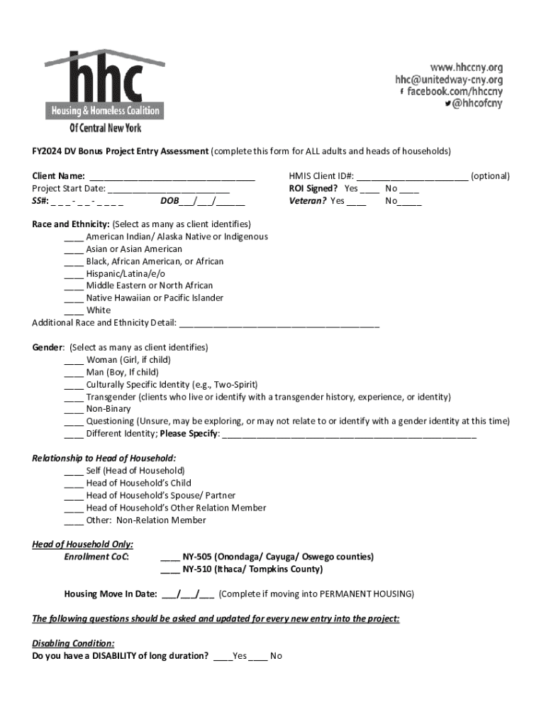 FY2024 DV Bonus Project Entry Assessment (complete this form for ALL adults and heads of households) Client Name: ___ Project Start Date: ___ SS#: _ _ _ _ _ _ _ _ _ DOB___/___/___HMIS Client ID#: