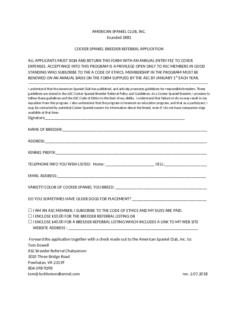 The New to American Cocker Spaniels and looking for more info is a Word document required to be submitted to the required address to provide certain information. It must be completed and signed, which is possible manually, or using a certain software like PDFfiller. It allows to fill out any PDF or Word document directly in your browser, customize it depending on your purposes and put a legally-binding electronic signature. Right away after completion, you can easily send the New to American Cocker Spaniels and looking for more info to the relevant recipient, or multiple individuals via email or fax. The blank is printable too due to PDFfiller feature and options presented for printing out adjustment. In both digital and in hard copy, your form will have a neat and professional look. Also you can save it as the template to use later, so you don't need to create a new blank form from the beginning. All that needed is to customize the ready document.