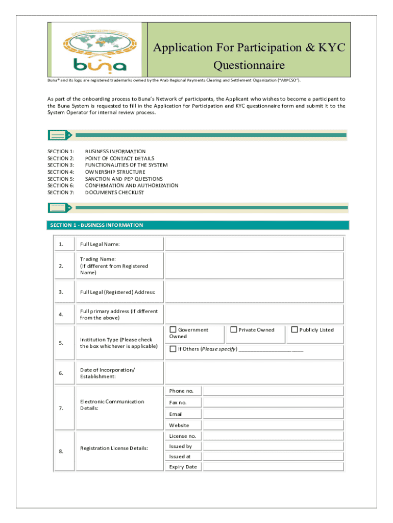 Application For Participation & KYC Questionnaire Buna and its logo are registered trademarks owned by the Arab Regional Payments Clearing and Settlement Organization (ARPCSO).As part of the onboarding