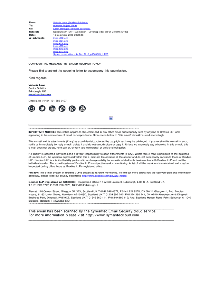 From: To: Cc: Subject: Date: Attachments:Victoria Lane (Bodies Solicitors) Horn sea Project Three Karen Hamilton (Bodies Solicitors) Spirit Energy IS 1 Submission Covering letter [BROAD.FID4510105]