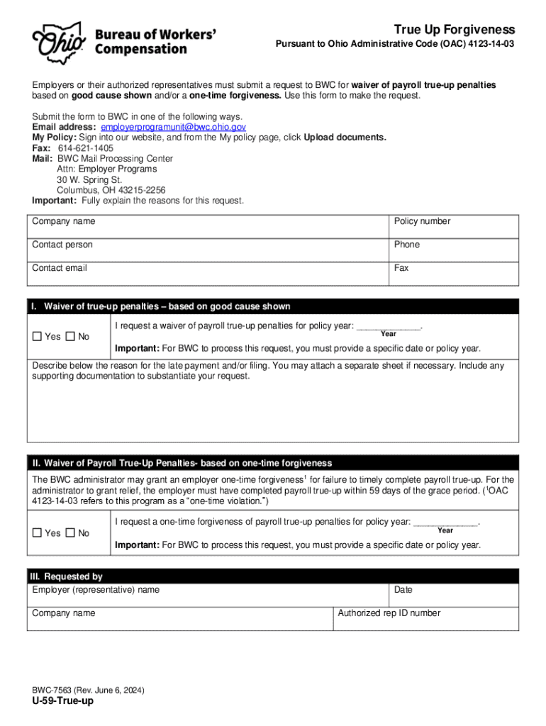 True Up Forgiveness Pursuant to Ohio Administrative Code (OAC) 41231403Employers or their authorized representatives must submit a request to BWC for waiver of payroll trueup penalties based on good