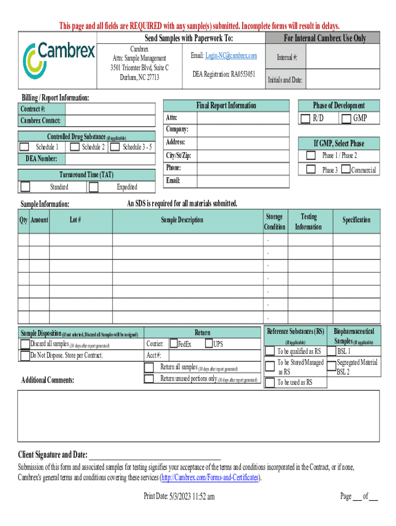This page and all fields are REQUIRED with any sample(s) submitted. Incomplete forms will result in delays. Send Samples with Paperwork To: For Internal Camber Use Only Camber Attn: Sample Management