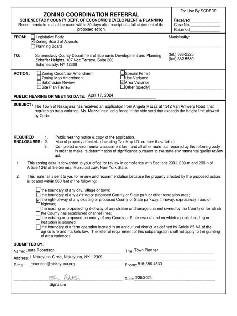 The Zoning Board of Appeals of the Town of Niskayuna will conduct a regular meeting on