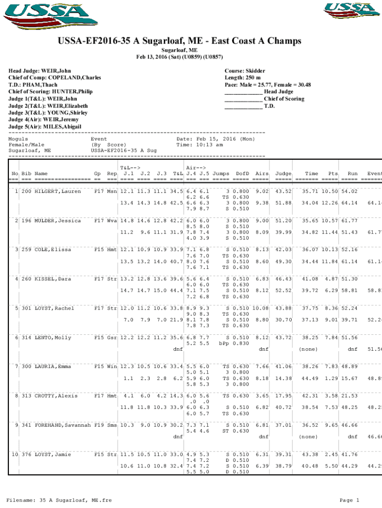 USSAEF201635 A Sugarloaf, ME East Coast A Champs Sugarloaf, ME Feb 13, 2016 (Sat) (U0859) (U0857) Head Judge: WEIR,John Chief of Comp: COPELAND,Charles T.D.: PHAM,Thach Chief of Scoring: HUNTER,Philip
