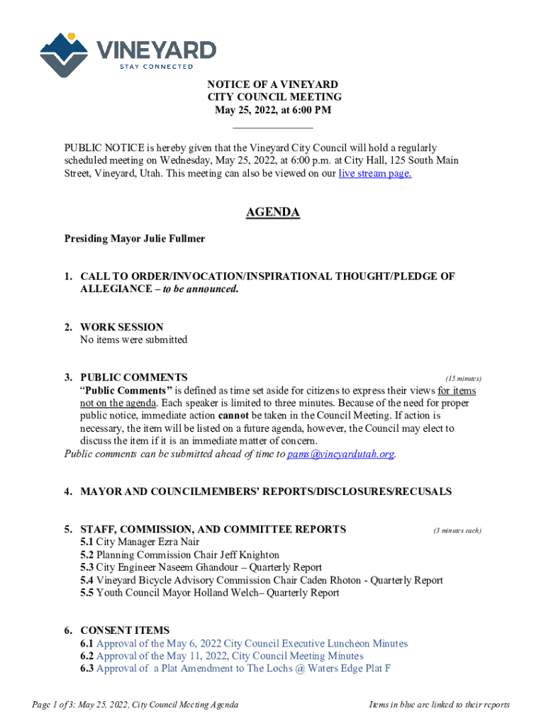 NOTICE OF A VINEYARD CITY COUNCIL MEETING May 25, 2022, at 6:00 PM ___ PUBLIC NOTICE is hereby given that the Vineyard City Council will hold a regularly scheduled meeting on Wednesday, May 25, 2022,