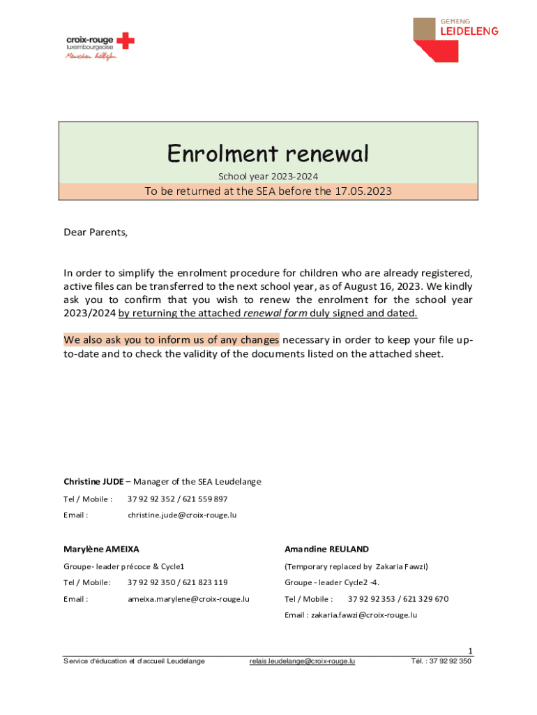 Enrolment renewal School year 20232024To be returned at the SEA before the 17.05.2023 Dear Parents,In order to simplify the enrolment procedure for children who are already registered, active files