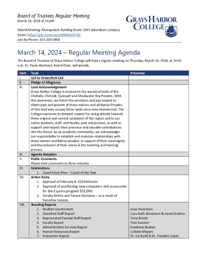 Board of Trustees Regular Meeting March 14, 2024, at 10 Hybrid Meeting: Man speaker Building Room 2255 (Aberdeen Campus) Zoom: https://ghc.zoom.us/j/84944203782 Join by Phone: 2532050468March 14,