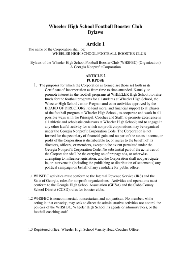 Wheeler High School Football Booster Club Bylaws Article 1 The name of the Corporation shall be: WHEELER HIGH SCHOOL FOOTBALL BOOSTER CLUB Bylaws of the Wheeler High School Football Booster Club (HSBC)