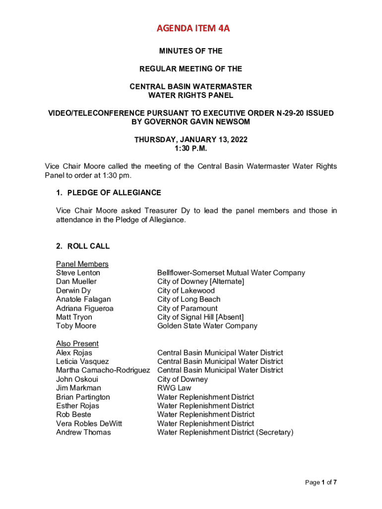 AGENDA ITEM 4A MINUTES OF THE REGULAR MEETING OF THE CENTRAL BASIN WATERMASTER WATER RIGHTS PANEL VIDEO/TELECONFERENCE PURSUANT TO EXECUTIVE ORDER N2920 ISSUED BY GOVERNOR GAVIN NEWSOM THURSDAY, JANUARY