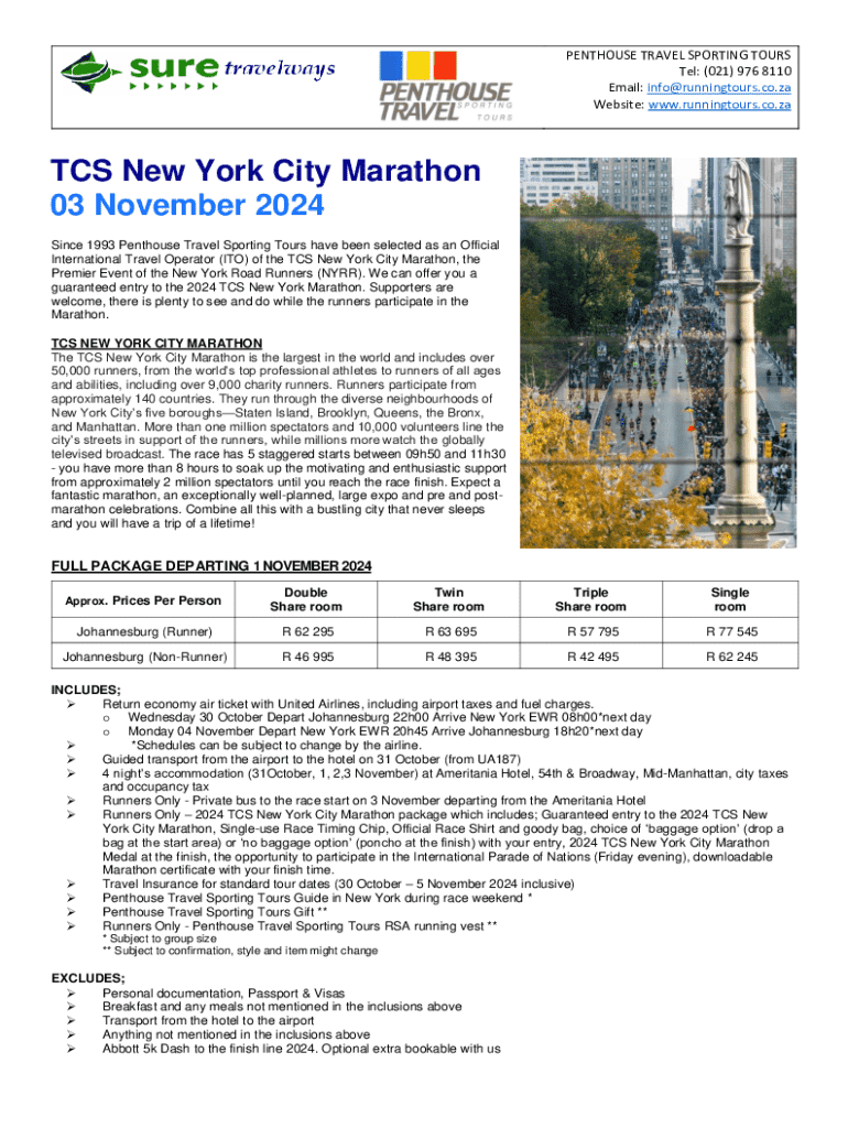 Join Penthouse Travel Sporting Tours for the 2024 TCS New York City Marathon. Enjoy guaranteed entry, full travel package, and an unforgettable experience!