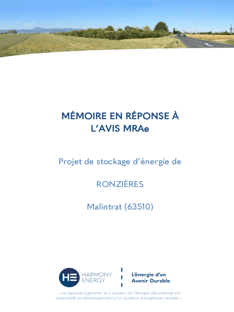 Projet de stockage de Ronzires | Mmoire en rponse lavis de la MRAeMai 2024MMOIRE EN RPONSE LAVIS MRAe Projet de stockage dnergie de RONZIRES Malintrat (63510) La capacit gnrer et stocker de lnergie