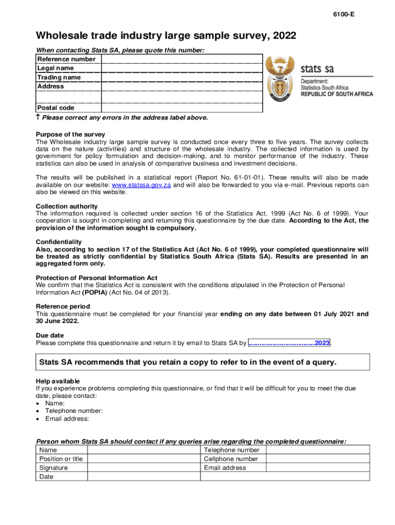 This survey collects data on the wholesale industry in South Africa for policy and decision-making, covering activities, structure, and performance from 2021 to 2022.