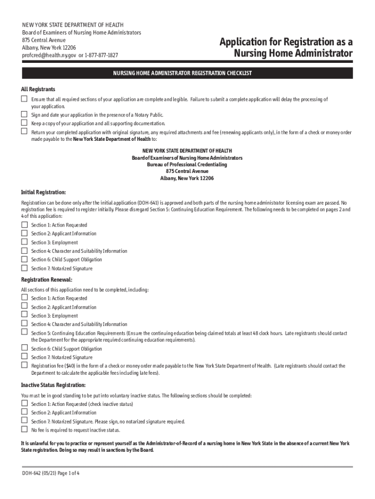 Complete the Application for Registration as a Nursing Home Administrator, ensuring all sections are filled and notarized according to NYS guidelines.
