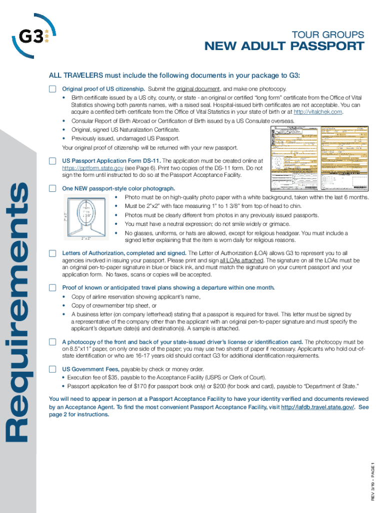 NEW ADULT PASSPORT ALL TRAVELERS must include the following documents in your package to G3: Original proof of US citizenship. Submit the original document, and make one photocopy. Birth certificate
