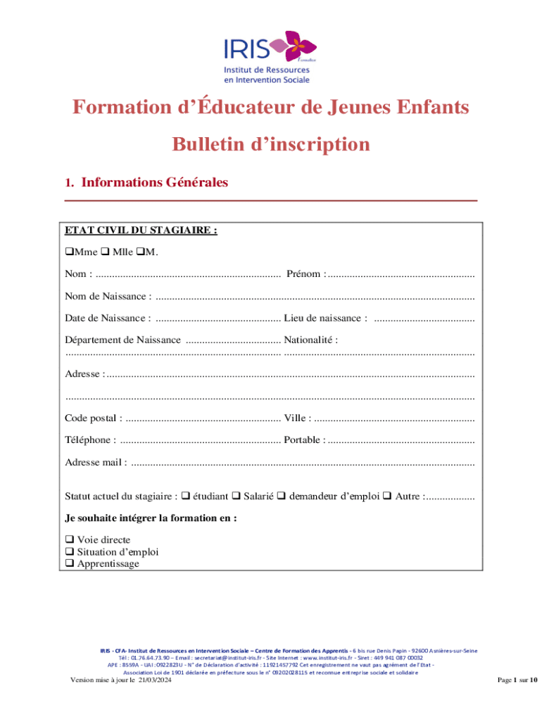 Formation dducateur de Jeunes Enfants Bulletin dinscription 1. Informations GnralesETAT CIVIL DU STAGIAIRE : Mme Mlle M. Nom : ....................................................................