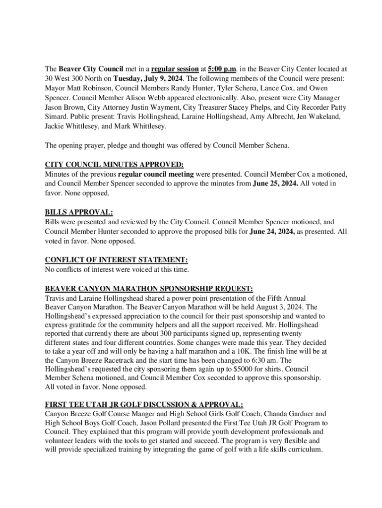 30 West 300 North on Tuesday, July 9, 2024. The following members of the Council were present: