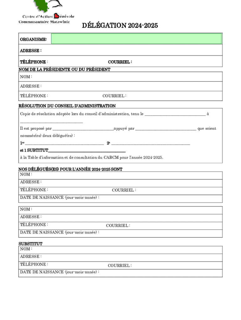 DLGATION 20242025 ORGANISME: ADRESSE : TLPHONE :COURRIEL :NOM DE LA PRSIDENTE OU DU PRSIDENT NOM : ADRESSE : TLPHONE :COURRIEL :RSOLUTION DU CONSEIL DADMINISTRATION Copie de rsolution adopte lors