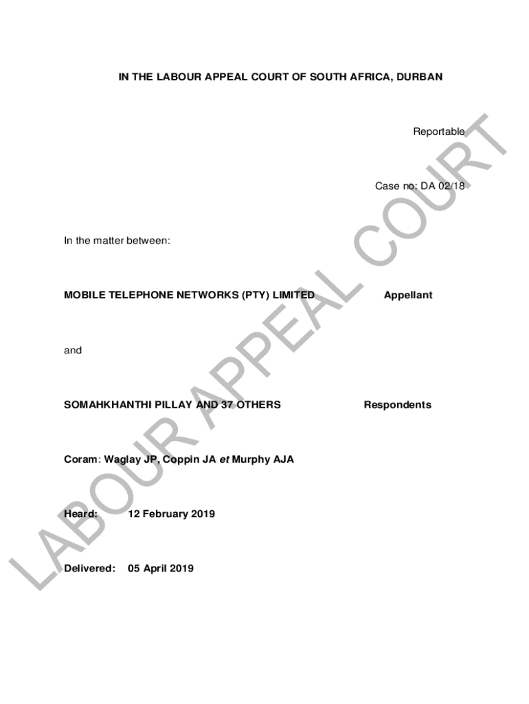 IN THE Labor APPEAL COURT OF SOUTH AFRICA, DURBANReportableCase no: DA 02/18In the matter between:MOBILE TELEPHONE NETWORKS (PTY) LIMITEDAppellantandSOMAHKHANTHI PILLAR AND 37 OTHERSCoram: Waylay