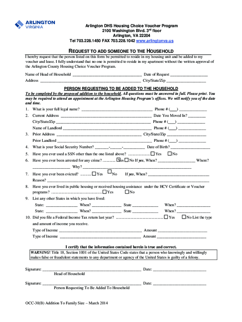 This form allows the head of household to request adding a new member to their Housing Choice Voucher Program. Ensure all information is completed for approval.