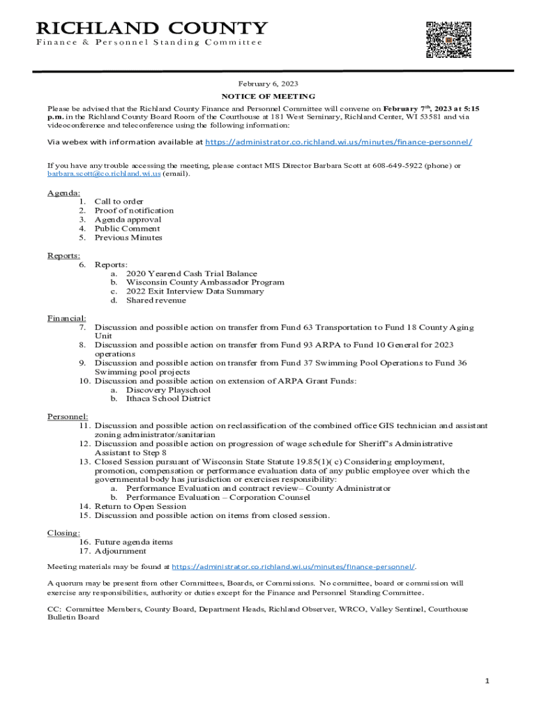 Richland County Finance & Personnel Standing CommitteeFebruary 6, 2023 NOTICE OF MEETING Please be advised that the Richland County Finance and Personnel Committee will convene on February 7th, 2023