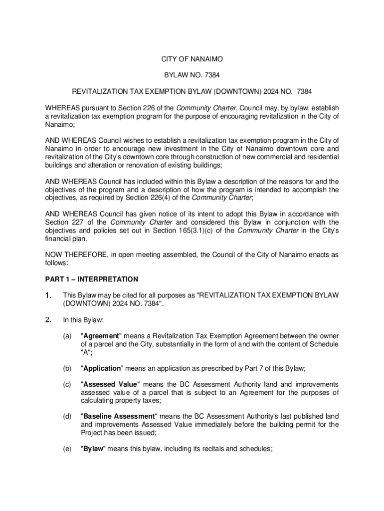 CITY OF NANAIMO BYLAW NO. 7384 REVITALIZATION TAX EXEMPTION BYLAW (DOWNTOWN) 2024 NO. 7384 WHEREAS pursuant to Section 226 of the Community Charter, Council may, by bylaw, establish a revitalization