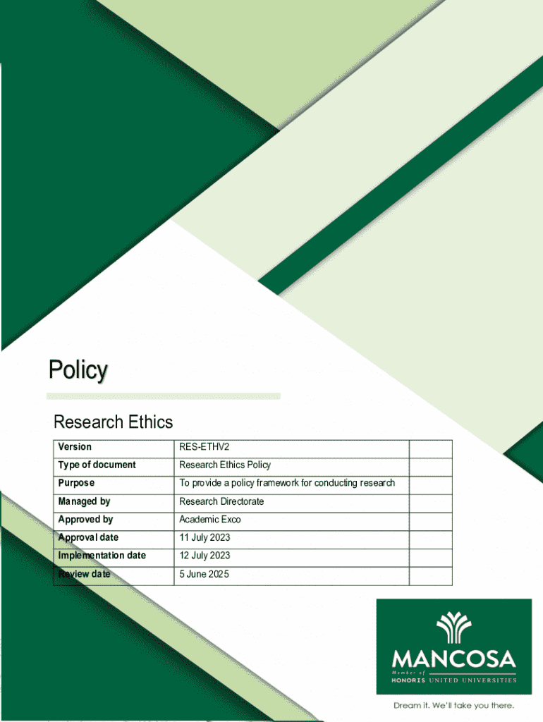 VersionRESETHV2Type of documentResearch Ethics PolicyPurposeTo provide a policy framework for conducting researchManaged research DirectorateApproved academic ExcoApproval date11
