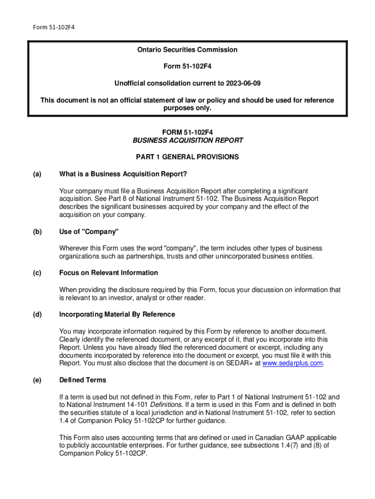 Get the free Unofficial Consolidation: Form 51-102f4 Business Acquisition ...