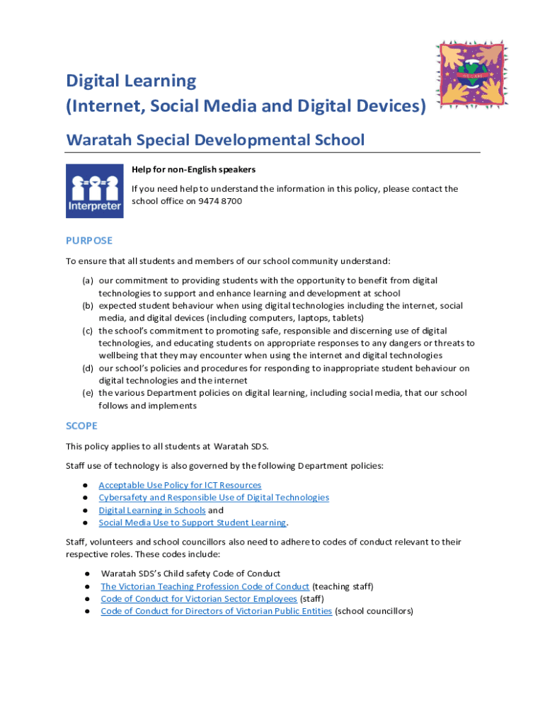 Digital Learning (Internet, Social Media and Digital Devices) Warmth Special Developmental School Help for non-English speakers If you need help to understand the information in this policy, please
