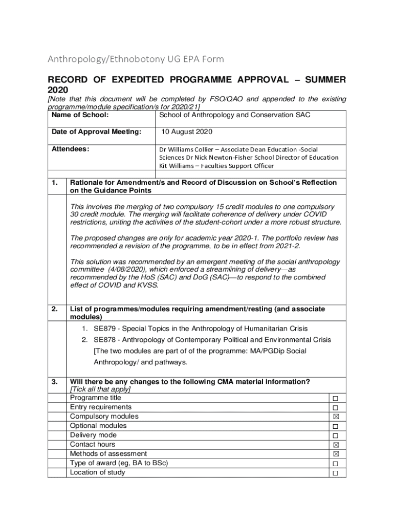 This document outlines the expedited programme approval process for the School of Anthropology and Conservation for the academic year 2020-21, including module amendments and responses to COVID.