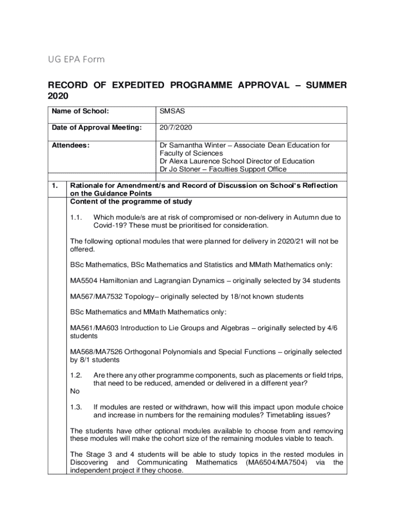 UG EPA Form RECORD OF EXPEDITED PROGRAMME APPROVAL SUMMER 2020 Name of School:SMSASDate of Approval Meeting:20/7/2020Attendees:Dr Samantha Winter Associate Dean Education for Faculty of Sciences Dr