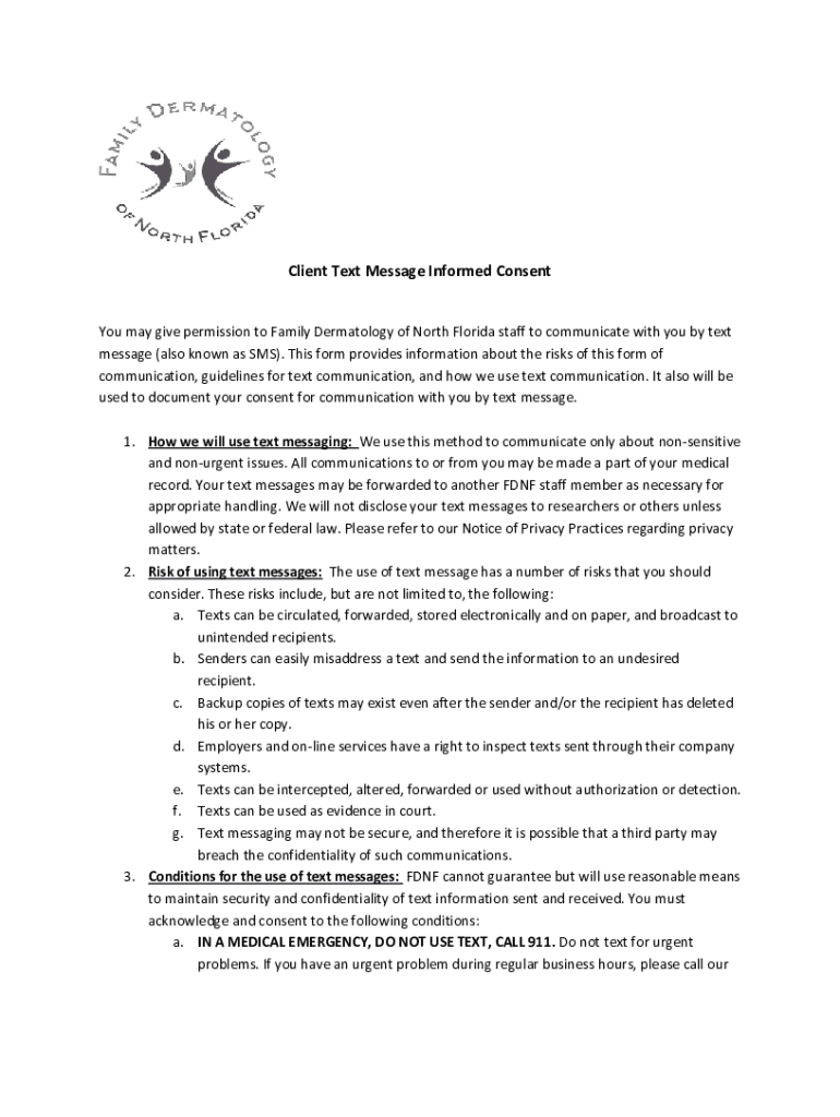 Client Text Message Informed ConsentYou may give permission to Family Dermatology of North Florida staff to communicate with you by text message (also known as SMS). This form provides information