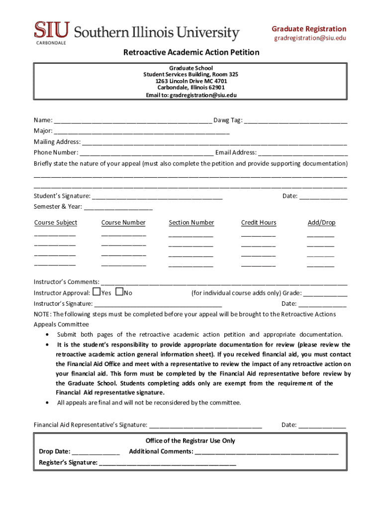 Graduate Registration gradregistration@siu.eduRetroactive Academic Action Information General Information No tuition or general student fees shall be refunded in cases where withdrawal occurs after
