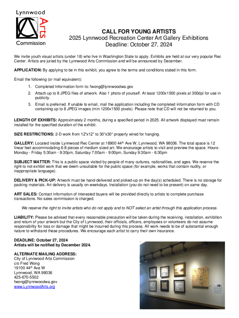 CALL FOR YOUNG ARTISTS 2025 Lynnwood Recreation Center Art Gallery Exhibitions Deadline: October 27, 2024 We invite youth visual artists (under 18) who live in Washington State to apply. Exhibits