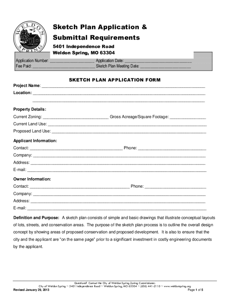 Sketch Plan Application & Submittal Requirements 5401 Independence Road Weldon Spring, MO 63304 FOR OFFICE USE ONLY Application Number: ___ Application Date: ___ Fee Paid: ___ Sketch Plan Meeting
