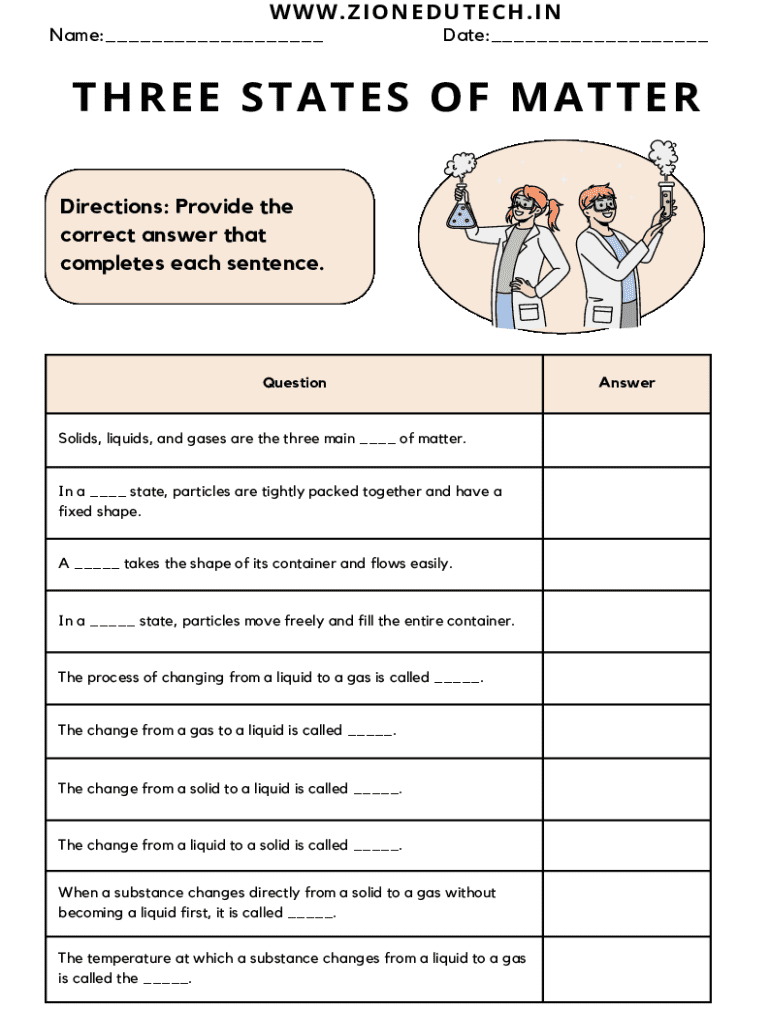 WWW.ZIONEDUTECH.IN Name:___Date:___THREE STATES OF MATTER Directions: Provide the correct answer that completes each sentence. QuestionSolids, liquids, and gases are the three main ___ of matter.