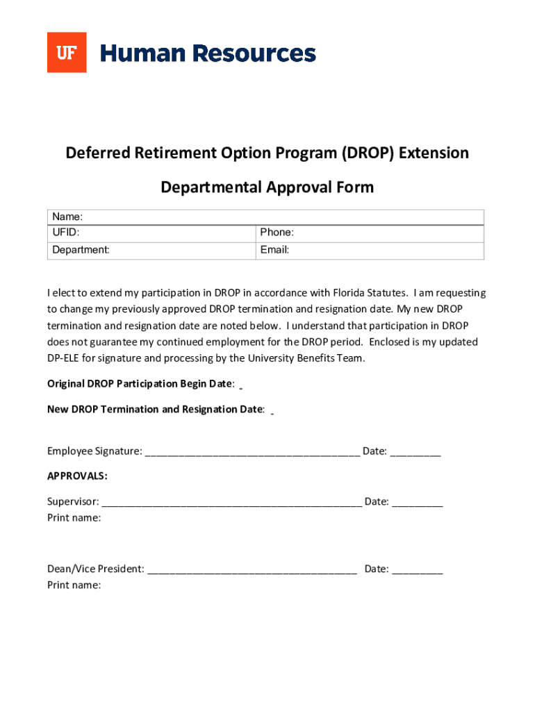 Deferred Retirement Option Program (DROP) Extension Departmental Approval Form Name: RFID:Phone:Department:Email:I elect to extend my participation in DROP in accordance with Florida Statutes. I am