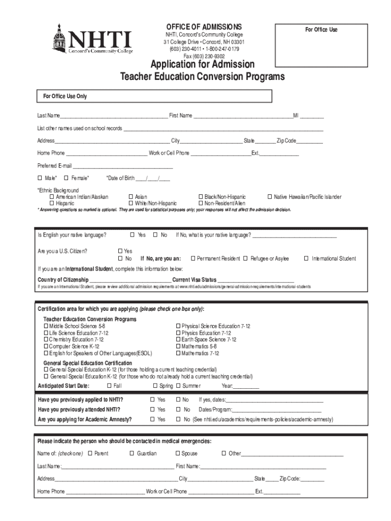 OFFICE OF ADMISSIONSFor Office UseNHTI, Concords Community College 31 College Drive Concord, NH 03301 (603) 2304011 18002470179 Fax (603) 2309302Application for Admission Teacher Education Conversion