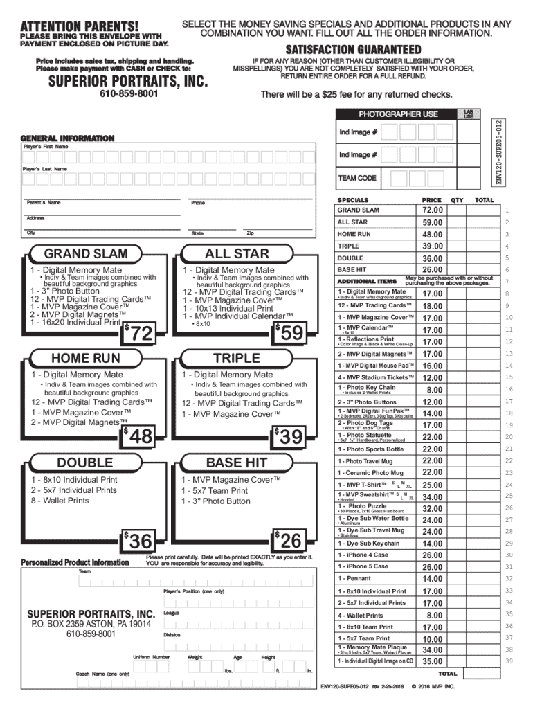 ATTENTION PARENTS!PLEASE BRING THIS ENVELOPE WITH PAYMENT ENCLOSED ON PICTURE DAY.SELECT THE MONEY SAVING SPECIALS AND ADDITIONAL PRODUCTS IN ANY COMBINATION YOU WANT. FILL OUT ALL THE ORDER INFORMATION.SATISFACTION