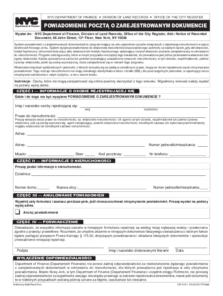 Department of Finance NYC DEPARTMENT OF FINANCElDIVISION OF LAND RECORDSlOFFICE OF THE CITY REGISTERPOWIADOMIENIE PO CZT O ZAREJESTROWANYM DOKUMENCIEWysa do: NYC Department of Finance, Division of