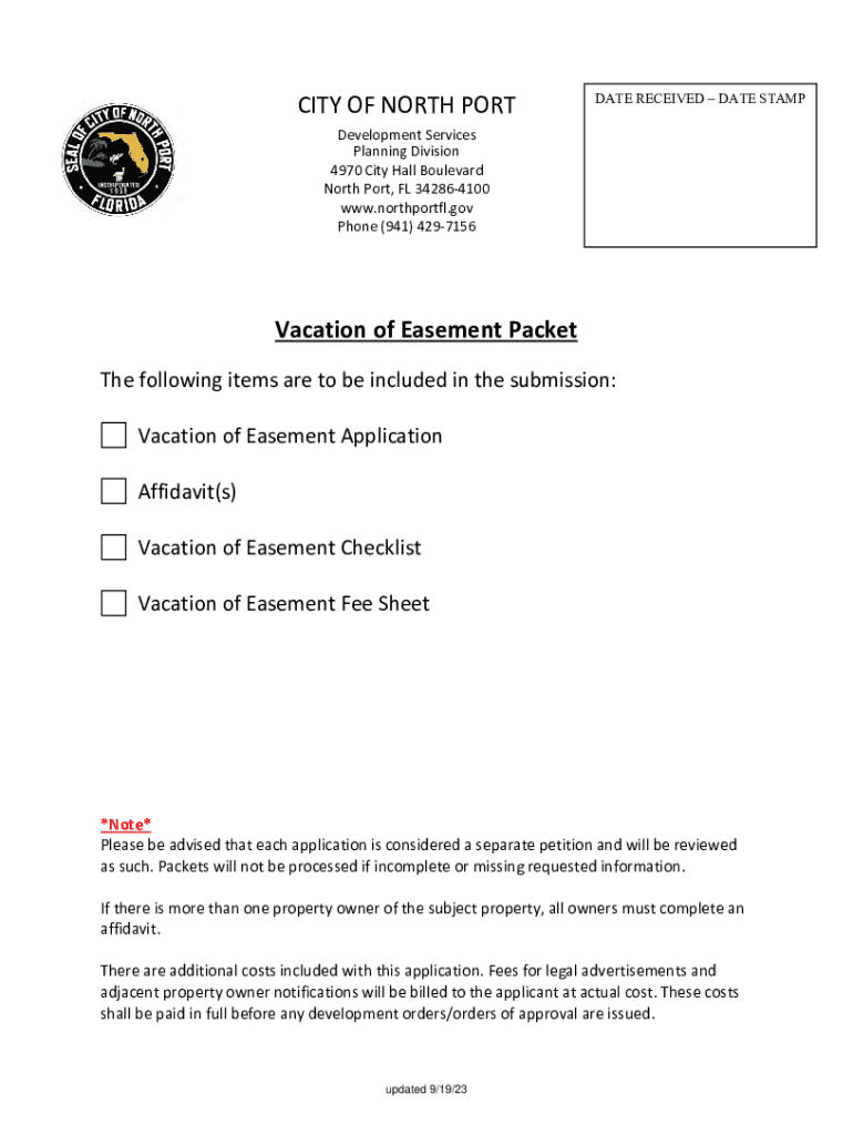 CITY OF NORTH PORTDATE RECEIVED DATE STAMPDevelopment Services Planning Division 4970 City Hall Boulevard North Port, FL 342864100 www.northportfl.gov Phone (941) 4297156Vacation of Easement Packet