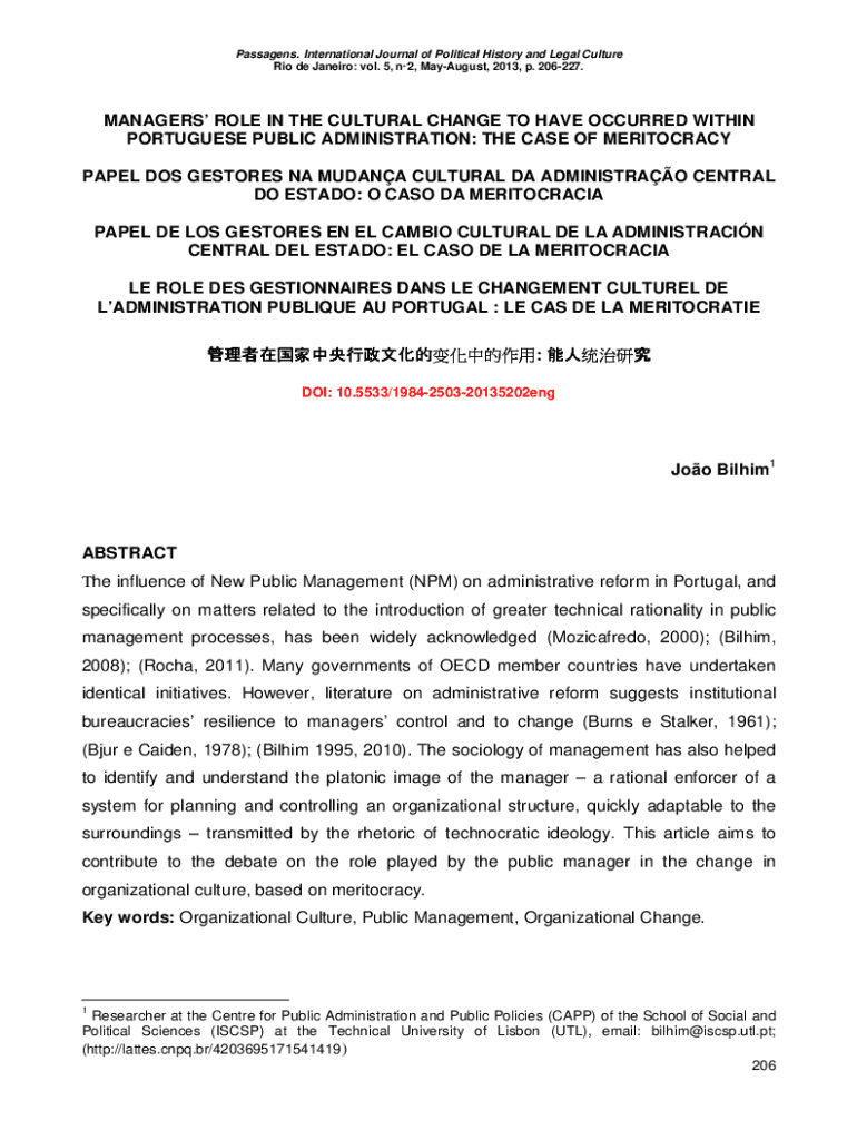 Passagens. International Journal of Political History and Legal Culture Rio de Janeiro: vol. 5, n .2, MayAugust, 2013, p. 206227. oMANAGERS ROLE IN THE CULTURAL CHANGE TO HAVE OCCURRED WITHIN PORTUGUESE