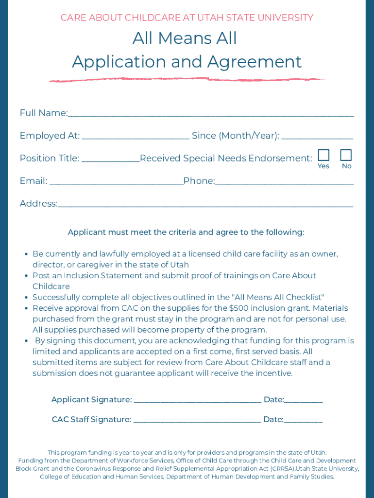 CARE ABOUT CHILDCARE AT UTAH STATE UNIVERSITYAll Means All Application and Agreement Full Name:___ Employed At: ___ Since (Month/Year): ___ Position Title: ___Received Special Needs Endorsement:YesNoEmail: