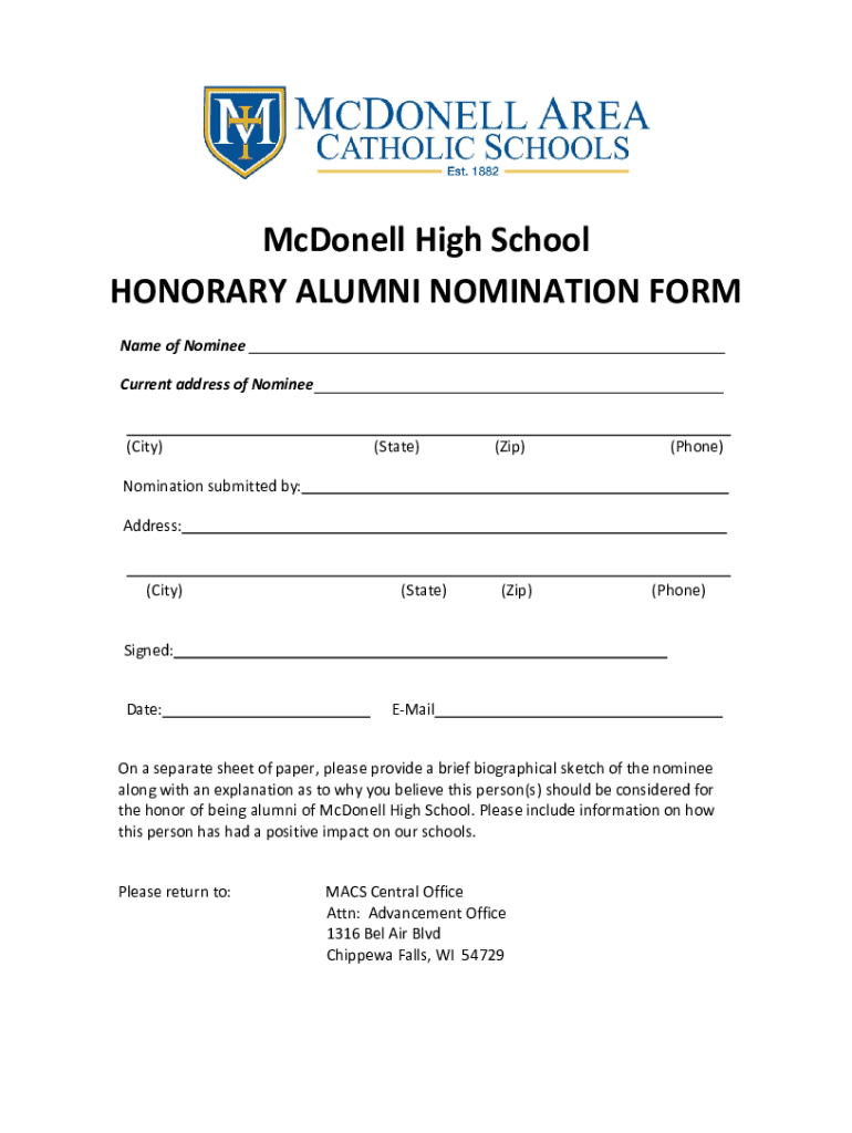 McDonell High School HONORARY ALUMNI NOMINATION FORM Name of Nominee Current address of Nominee (City)(State)(Zip)(Phone)Nomination submitted by: Address: (City)(State)(Zip)(Phone)Signed: Date:EMailOn