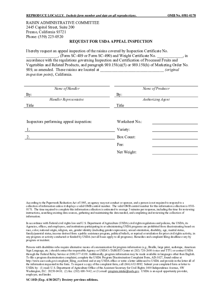 REPRODUCE LOCALLY. Include form number and date on all reproductions.OMB No. 05810178RAISIN ADMINISTRATIVE COMMITTEE 2445 Capitol Street, Suite 200 Fresno, California 93721 Phone: (559) 2250520 REQUEST