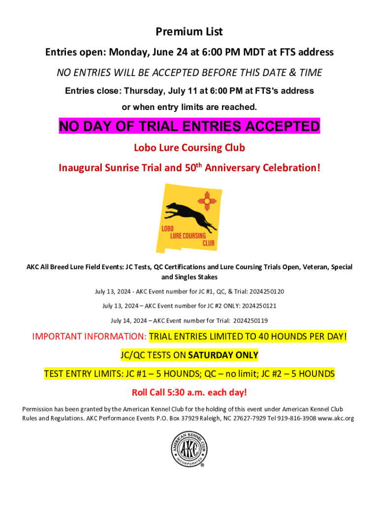 Premium List Entries open: Monday, June 24 at 6:00 PM MDT at FTS address NO ENTRIES WILL BE ACCEPTED BEFORE THIS DATE & TIME Entries close: Thursday, July 11 at 6:00 PM at FTS\'s address or when entry