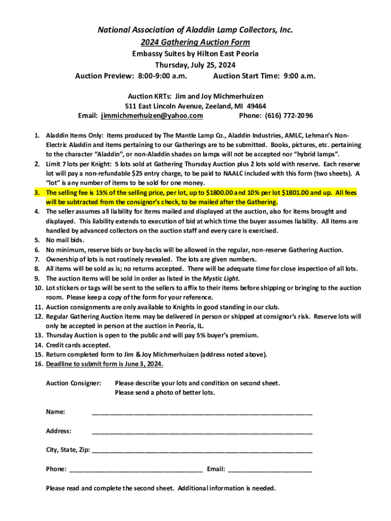 National Association of Aladdin Lamp Collectors, Inc. 2024 Gathering Auction Form Embassy Suites by Hilton East Peoria Thursday, July 25, 2024 Auction Preview: 8:009:00 a.m. Auction Start Time: 9:00