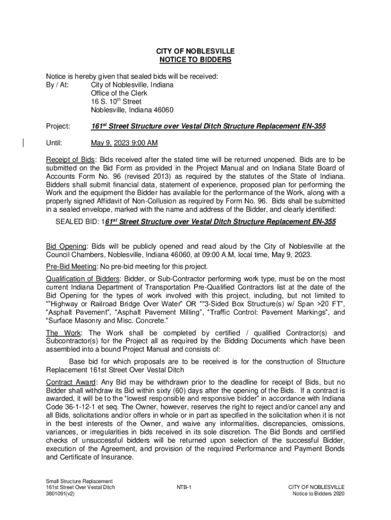 CITY OF NOBLESVILLE NOTICE TO BIDDERS Notice is hereby given that sealed bids will be received: By / At: City of Noblesville, Indiana Office of the Clerk 16 S. 10th Street Noblesville, Indiana 46060