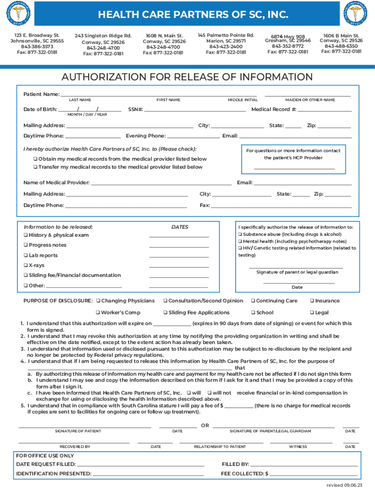 HEALTH CARE PARTNERS OF SC, INC. 123 E. Broadway St. Jacksonville, SC 29555 8433863573 Fax: 8773220181243 Singleton Ridge Rd. Conway, SC 29526 8432484700 Fax: 8773220181145 Palmetto Point Rd. Marion,